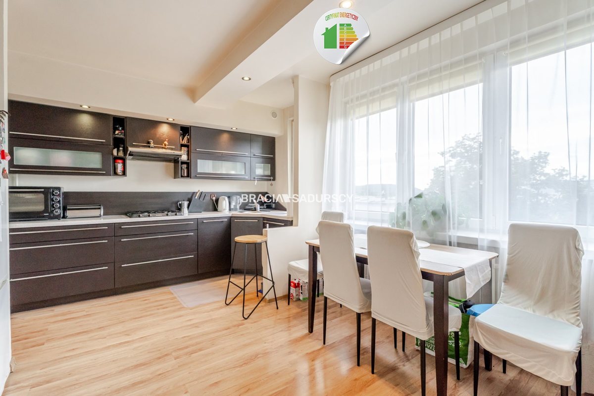 Na powierzchnie mieszkania 46,5 m 2 składają się 2 sypialnie o pow. 9,3 m 2 oraz 6,2 m 2 , salon z aneksem kuchennym o pow. 15 m 2 + kuchnia ok 5,2 m 2 ( kuchnia z oknem z możliwością wydzielenia niezależnej kuchni - układ pierwotny), łazienka z oknem i wc oraz przedpokój. Z jednej z sypialni wyjście na dużą, zabudowaną loggię (na szerokość dwóch pokoi) z widokiem na 2 kopce - ekspozycja południowa. Ekspozycja mieszkania południe i zachód dzięki czemu jest bardzo słoneczne, a w zimie nie trzeba używać ogrzewania w pokojach (duże nadpłaty za CO).