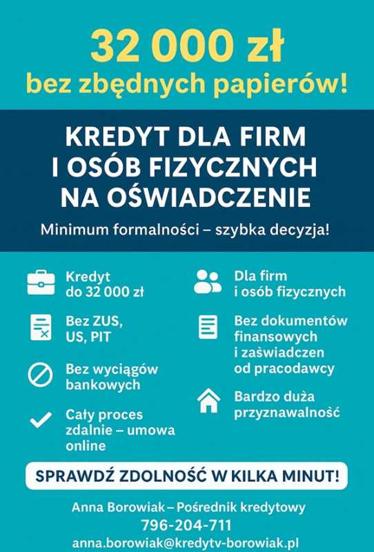 KREDYT DLA FIRM I OSÓB FIZYCZNYCH NA OŚWIADCZENIE – do 32 000 zł Szybka decyzja, minimum formalności, wysoka przyznawalność! ✅ Kredyt do 32 000 zł ✅ Dla firm i osób fizycznych ✅ Bez dokumentów z ZUS i US ✅ Bez dokumentów finansowych ✅ Bez zaświadczeń od pracodawcy i bez wyciągów z konta ✅ Wstępna decyzja już w kilka minut ✅ Całkowicie zdalny proces – podpiszesz umowę bez wychodzenia z domu! ✅ Bardzo duża przyznawalność! ⚠️ WYMAGANE: przesłanie raportu BIK prywatnego do wstępnej analizy ❌ Nie weryfikujemy BIK-u firmowego ❌ Nie akceptujemy chwilówek w BIK-u ℹ️ Oferta dotyczy kredytu bankowego Dlaczego warto? ✅Minimum formalności = szybka wypłata środków ✅Indywidualne podejście do każdego klienta ✅Możliwość wcześniejszej spłaty bez dodatkowych kosztów ✅Doświadczenie i profesjonalna obsługa Skontaktuj się już dziś: Anna Borowiak – Pośrednik kredytowy tel. 796-204-711 ✉️ anna.borowiak@kredyty-borowiak.pl www.kredyty-borowiak.pl facebook.com/kredytydlaprzedsiebiorcow2023 Nie zwlekaj – sprawdź swoją zdolność już teraz i otrzymaj decyzję nawet w kilka minut!