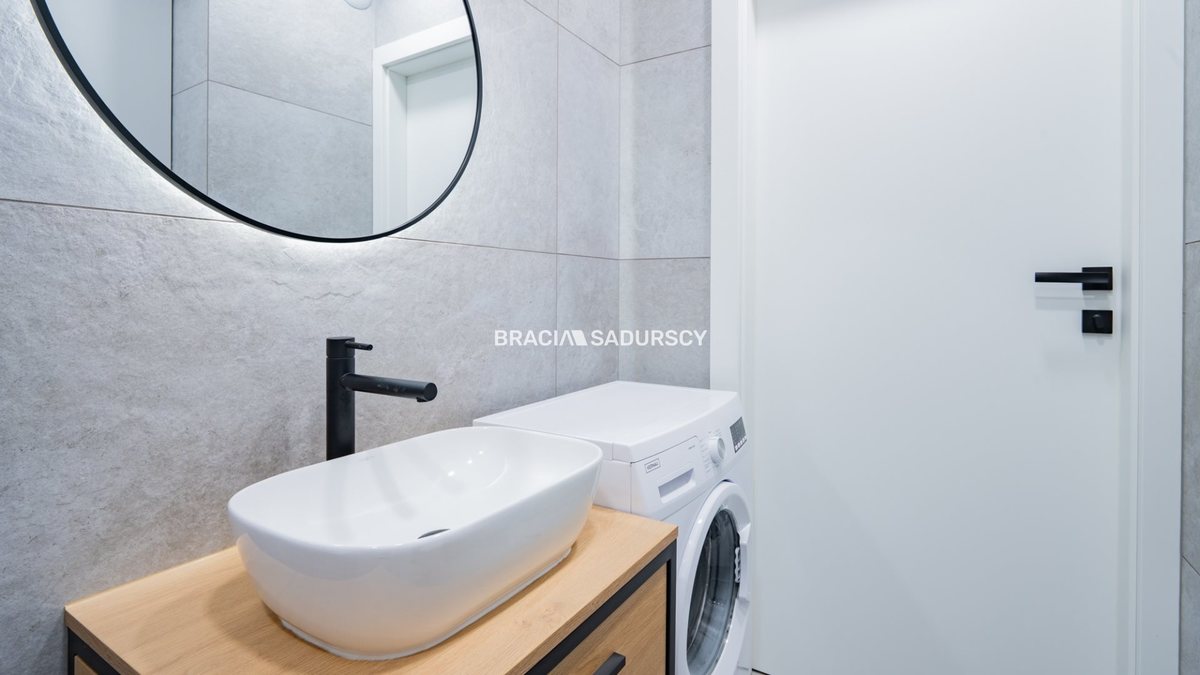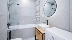 Wyposażenie łazienki: WC, umywalka, pralka, lustro, kabina prysznicowa