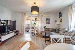 Mieszkanie bardzo jasne, trójstronna ekspozycja okien (wsch-płn-zach). Składa się z dużego salonu z klimatycznym kominkiem połączonego z aneksem kuchennym (w pełni wyposażony we wszystkie AGD), sypialni z dużą garderobą, łazienki z wc oraz przedpokoju. Z salonu wyjście na balkon - ekspozycja zachodnia.