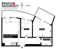 - Powierzchnia: 3 pokoje, w tym dwa oddzielne + salon z aneksem kuchennym