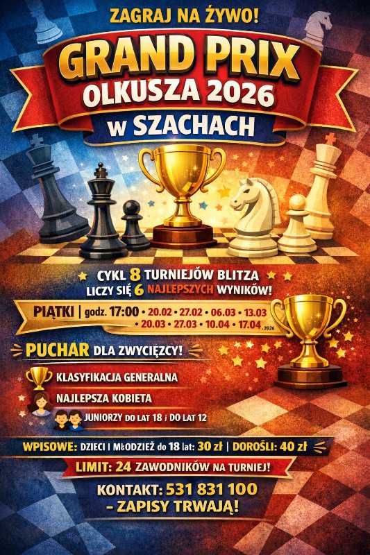 Zapraszamy serdecznie na GRAND PRIX OLKUSZA 2026 w SZACHACH. Czy masz dość grania tylko w Internecie? Zagraj na żywo z innymi miłośnikami królewskiej gry! Zapraszamy na cykl 8 turniejów blitza rozgrywanych w Olkuszu przy ul. Mickiewicza 8. Piątki, godz. 17.00. Terminy: 20.02, 27.02, 06.03, 13.03, 20.03, 27.03, 10.04 i 17.04.2026. Nagrody: klasyfikacja generalna, najlepsza kobieta, najlepszy junior do lat 18, najlepszy junior do lat 12. Wpisowe w każdym turnieju: dzieci i młodzież do 18 lat – 30 zł, dorośli – 40 zł. Zapisy trwają – osobno na każdy turniej do 30.01.2026 r. Kontakt: 531831100.