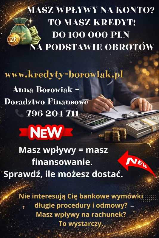 🚨 MASZ WPŁYWY NA KONTO? TO MASZ KREDYT. DO 100 000 PLN – NA PODSTAWIE OBROTÓW Nie interesują Cię bankowe wymówki, długie procedury i odmowy? Masz wpływy na rachunek? To wystarczy. 💥 KREDYT DLA FIRM I OSÓB FIZYCZNYCH ✔️ Firmy już od 3 miesięcy działalności ✔️ Osoby fizyczne – min. 3 miesiące pracy ✔️ Decyzja na podstawie realnych wpływów, nie papierów ✔️ Minimum dokumentów ✔️ Szybka decyzja ✔️ Wysoka skuteczność ✔️ Kwoty nawet do 100 000 PLN ⛔ Nie odkładaj tematu. ⛔ Nie trać czasu na składanie wniosków „w ciemno”. 👉 Napisz lub zadzwoń TERAZ – sprawdzę Twoje możliwości od ręki, bez kosztów i bez zobowiązań. Anna Borowiak – Doradztwo Finansowe 📞 796 204 711 ✉️ anna.borowiak@kredyty-borowiak.pl 🌐 www.kredyty-borowiak.pl 🔴 Masz wpływy = masz finansowanie. Sprawdź, ile możesz dostać.