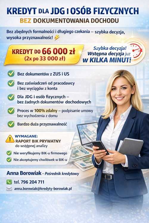 KREDYT DLA JDG I OSÓB FIZYCZNYCH BEZ DOKUMENTOWANIA DOCHODU Szybka decyzja i wysoka przyznawalność. Już przy pierwszej ofercie na 33 000 zł istnieje możliwość złożenia drugiego wniosku również na oświadczenie. Łącznie nawet do 66 000 zł (2 × 33 000 zł) – kredyt bankowy dostępny w prosty sposób. • dla firm i osób fizycznych • bez dokumentów dochodowych • bez zaświadczeń z ZUS i US • bez zaświadczeń od pracodawcy i wyciągów z konta • wstępna decyzja w kilka minut • proces w 100% zdalny – podpisanie umowy bez wychodzenia z domu • bardzo wysoka przyznawalność Wymagany: raport BIK prywatny do wstępnej analizy Nie weryfikujemy BIK firmowego Nie akceptujemy chwilówek w BIK Anna Borowiak - Pośrednik kredytowy tel. 796 204 711 anna.borowiak@kredyty-borowiak.pl www.kredyty-borowiak.pl