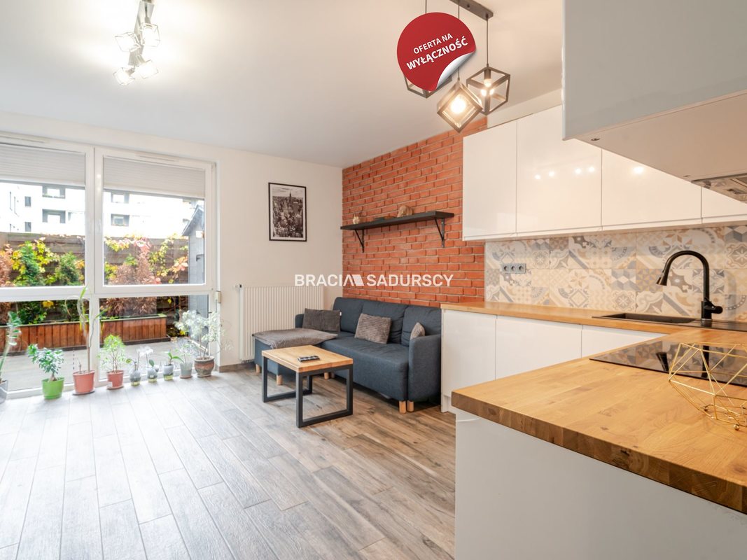 Salon z aneksem kuchennym - 16 m², wyjście do większego ogródka - 23 m², z tarasem i meblami ogrodowymi