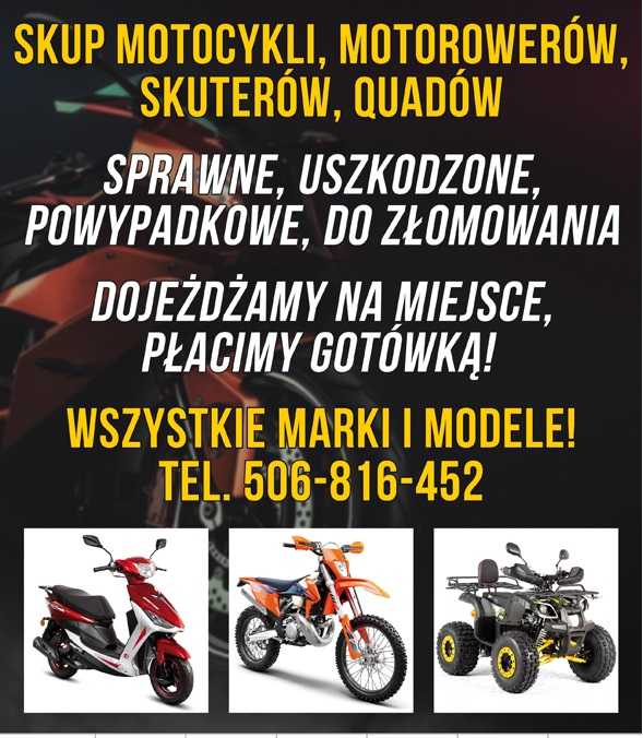 SKUP MOTOCYKLI, MOTOROWERÓW, SKUTERÓW, QUADÓW, ATV, SKUTERÓW WODNYCH, ŚNIEŻNYCH, BUGGY, KARTINGÓW! Skupujemy pojazdy wszystkich marek i modele- także Chińskie! W pełni sprawne, uszkodzone, do poprawek lub powypadkowe! Dojeżdżamy na miejsce, płacimy gotówką od ręki! Gwarantujemy szybki odbiór, minimum formalności. Odbieramy motocykle własnym transportem. Dziś dzwonisz- dziś sprzedajesz! Zachęcamy do kontaktu 24h/7! Pisz, dzwoń- dogadamy się! Działamy na terenie całej Polski! TEL: 506 816 452 Do wyszukiwarki: skup kupię kupno odkup sprzedać sprzedaj odsprzedać komis motocykl motocykle motocykli motocyklowy motocyklowe skuter buggy bugy karting kartingi kartingów skutery skuterów quad quady quadów atv utv ssv skuter wodny wodne wodnych śnieżny śnieżnych śnieżne powypadkowe powypadkowy uszkodzony wypadek motocyklowy wypadki powypadku motorowery motorowery motorowerów motor motory motorów stare starych zabytkowy zabytkowe zabytki zabytków złom złomowanie złomujemy złom motocyklowy złom motorów motory motory cross crossy crossów enduro choper chopper choperów chopery choppery chopperów ścigacz ścigaczy ścigacze turystyczne turystyków turystyki turystycznych po wypadku powypadkowych turystyczny naked nakedów nakedy małopolska małopolskie śląskie śląsk opolskie podkarpackie podkarpacie gotówka gotówkę sprzedać sprzedaj sprzedaż dolnośląskie łódzkie świętokrzyskie wielkopolskie pomorskie kujawsko-pomorskie zachodnio-pomorskie pomorze pomorzu podlaskie podlasie warmińsko-mazurskie mazowieckie mazowsze cała całej polski polska polsce polski całe