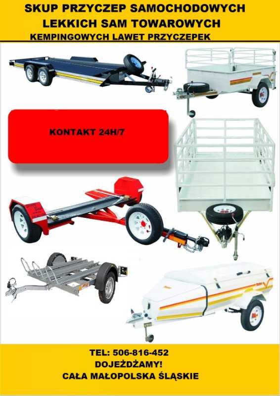 SKUP PRZYCZEP, PRZYCZEPEK SAMOCHODOWYCH LEKKICH, CIĘŻKICH! Skupujemy przyczepy: towarowe, kempingowe, lekkie samochodowe, typu SAM, bagażowe, furgony, handlowe, gastronomiczne, do przewozu koni, do przewozu mini koparek, do przewozu motocykli (motocyklowe), quadów, izotermy, lawety. Skupujemy w każdym stanie technicznym. Sprawne, uszkodzone, do poprawek a także bez homologacji. Dojeżdżamy na miejsce, płacimy gotówką od ręki! Cała małopolska, śląskie, dojeżdżamy także w inne rejony kraju 24h/7 Zapraszamy do kontaktu 7 dni w tygodniu! Dziś dzwonisz- dziś sprzedajesz! Dziś gotówka! TEL: 506 816 452 PRZYJEDZIEMY DO CIEBIE JESZCZE DZIŚ! Do wyszukiwarki: skup kupno odkup kupię komis przyczep przyczepek przyczepy przyczepa przyczepkę przyczepki przyczepek samochodowe samochodowa samochodowych samochodowy lawet laweta lawety lawetę podłodziowych podłodziowa podłodziowe skuterów wodnych wodne wodna bagażowych bagażowe bagażowa furgonów koniowozy koniowóz przewozu koni konia sam samy samów motocyklowe motocyklowa motocyklowych quada quad quadów quadowe quadowa atv towarowych towarowe towarowa gastronomicznych gastronomiczne gastronomiczna kempingowe kempingowych kempingi kempingowa kamperów kamper skup samochodów kempingowych kampingowych kampingowe kampingowa kampery małopolska małopolski małopolsce śląsk śląskie śląsku sprzedać sprzedaż sprzedaj gotówka gotówkę pieniądze dojazd z dojazdem z własnym własny odbiór śląski