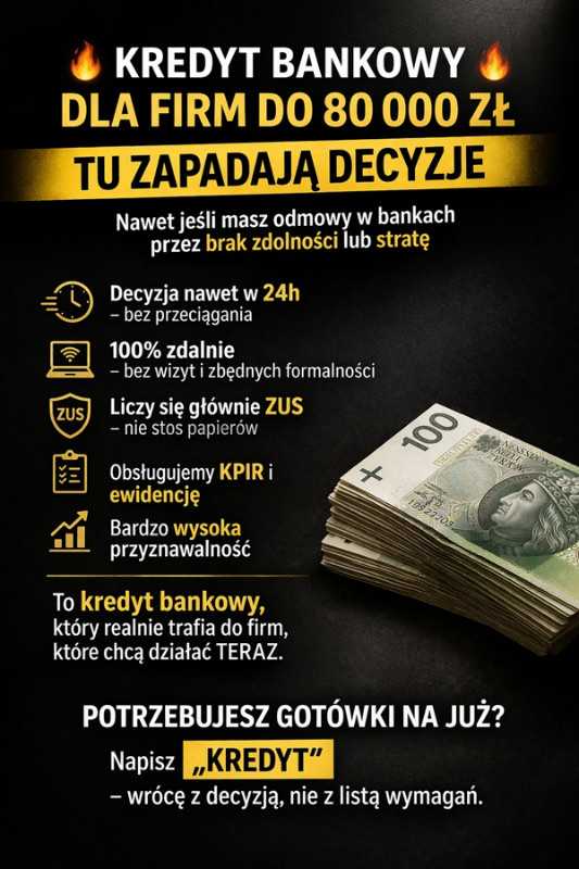 KREDYT BANKOWY DLA FIRM DO 80 000 ZŁ – TU ZAPADAJĄ DECYZJE Ile razy odbiłeś się od banku? „Brak zdolności”… „za krótko działa”… „proszę dosłać jeszcze dokumenty”… STOP. Tu gramy inaczej. Decyzja nawet w 24h – bez przeciągania 100% zdalnie – bez wizyt i zbędnych formalności Liczy się głównie ZUS – nie stos papierów Obsługujemy KPIR i ewidencję Bardzo wysoka przyznawalność Nawet jeśli masz odmowy w bankach przez brak zdolności lub stratę Nawet jeśli „na papierze” wygląda to słabo Tu nie analizujemy w nieskończoność. Tu liczy się efekt: pieniądze na koncie. To nie jest kolejna „oferta do sprawdzenia”. To kredyt bankowy, który realnie trafia do firm, które chcą działać, a nie czekać. Potrzebujesz gotówki na już? Prześlij BIK do analizy,a ja powiem Ci ile gotówki możesz otrzymać! Napisz „KREDYT” – wrócę z decyzją, nie z listą wymagań. Anna Borowiak tel. 796 204 711 anna.borowiak@kredyty-borowiak.pl